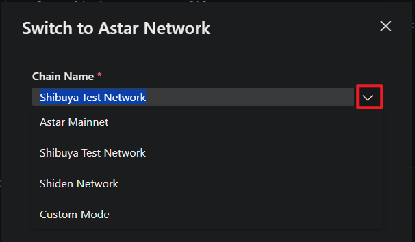 ChainIDE supports switching between four networks: Astar Mainnet, Shibuya Testnet, Shiden Mainnet, and Custom Network.