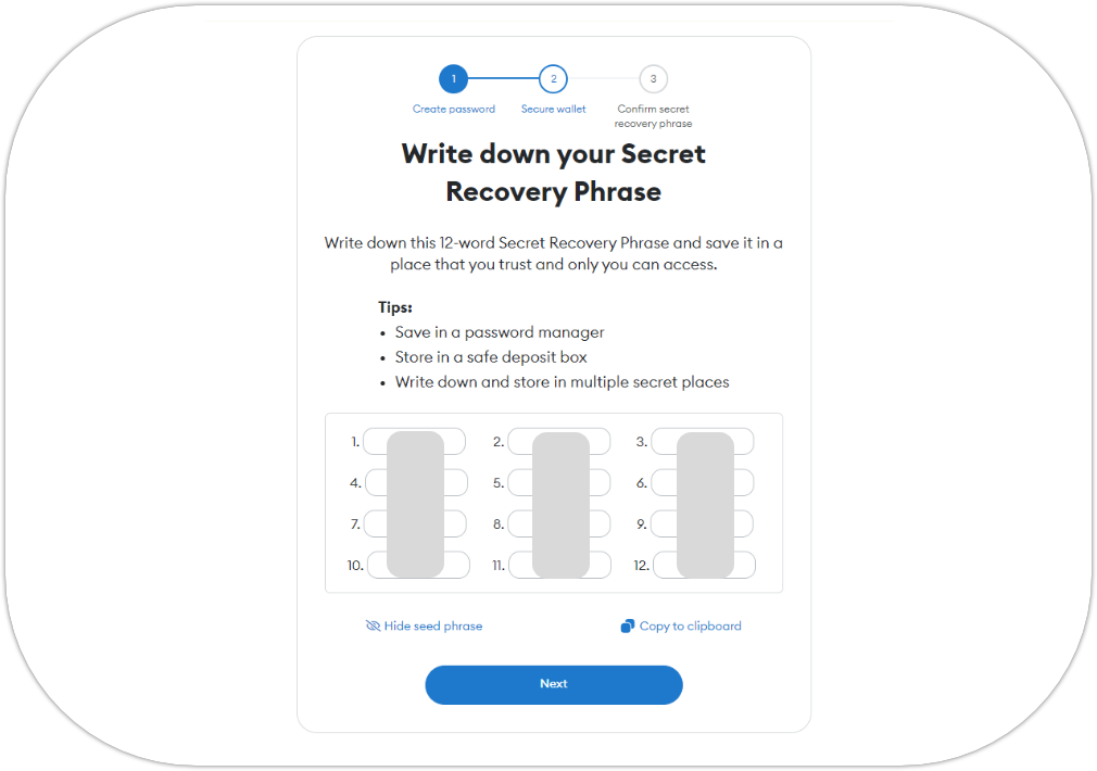 1. Keep the 12-word secret recovery phrase in a safe place where only you can access it;