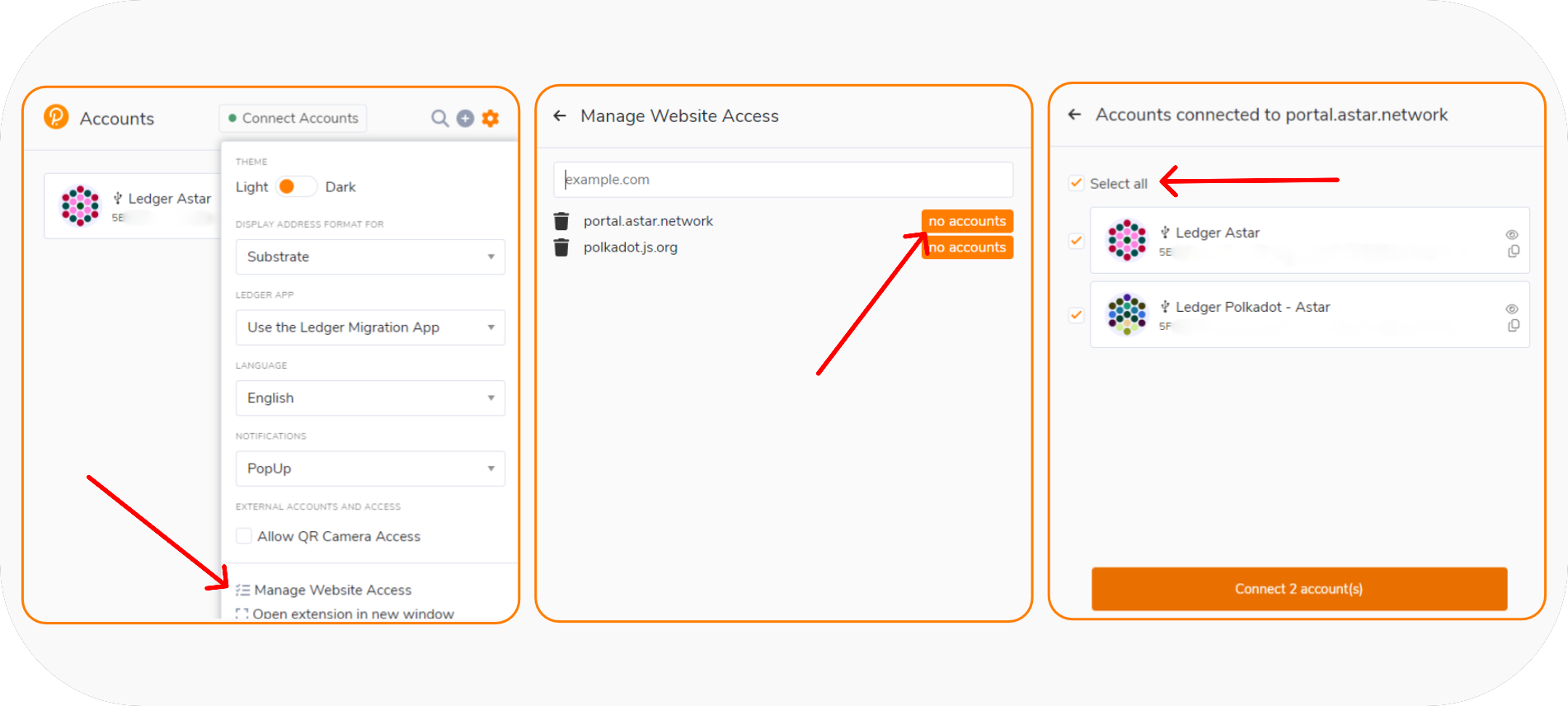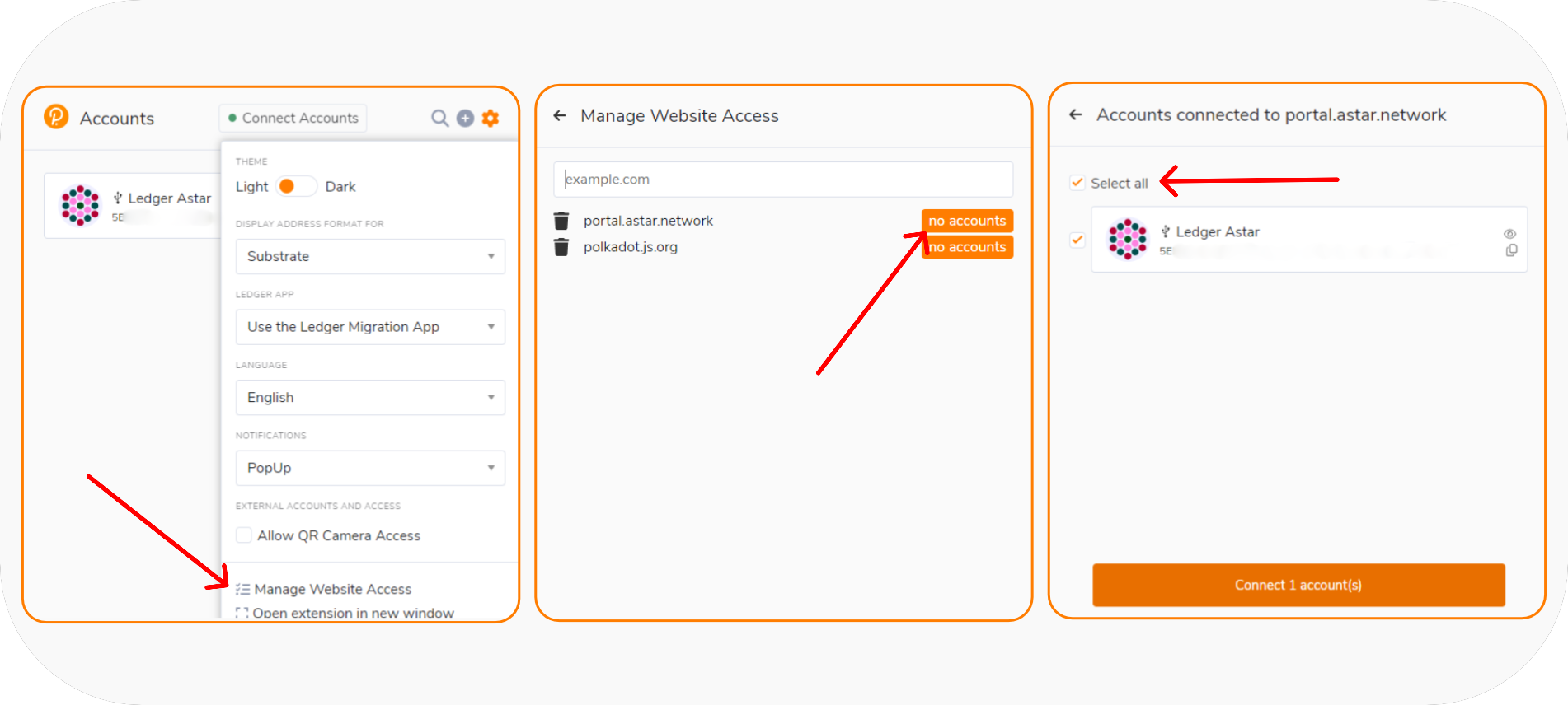 If you can't see your wallet, open the Polkadot.js extension settings and allow the wallet to manage the Astar portal.