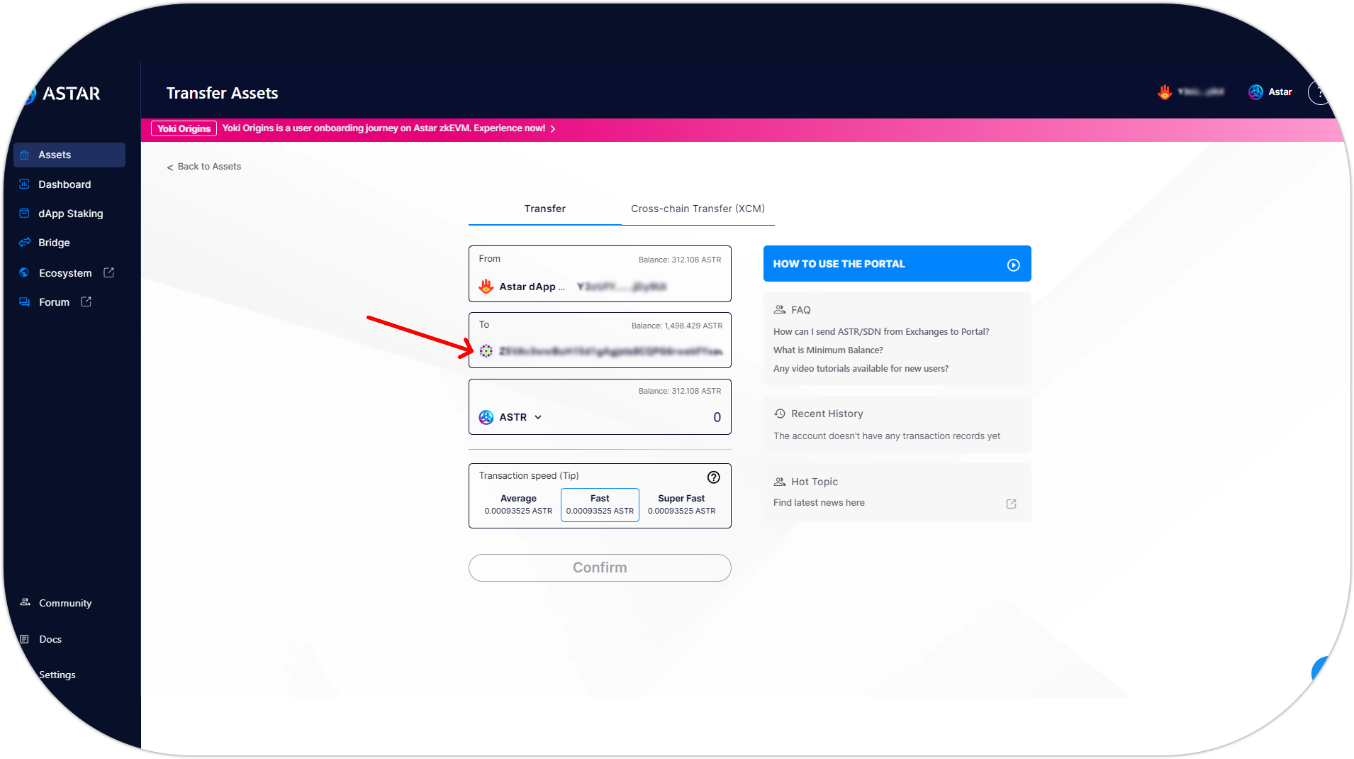 - You are now on the transfer page. Enter your Astar EVM address and the amount you want to transfer, then press