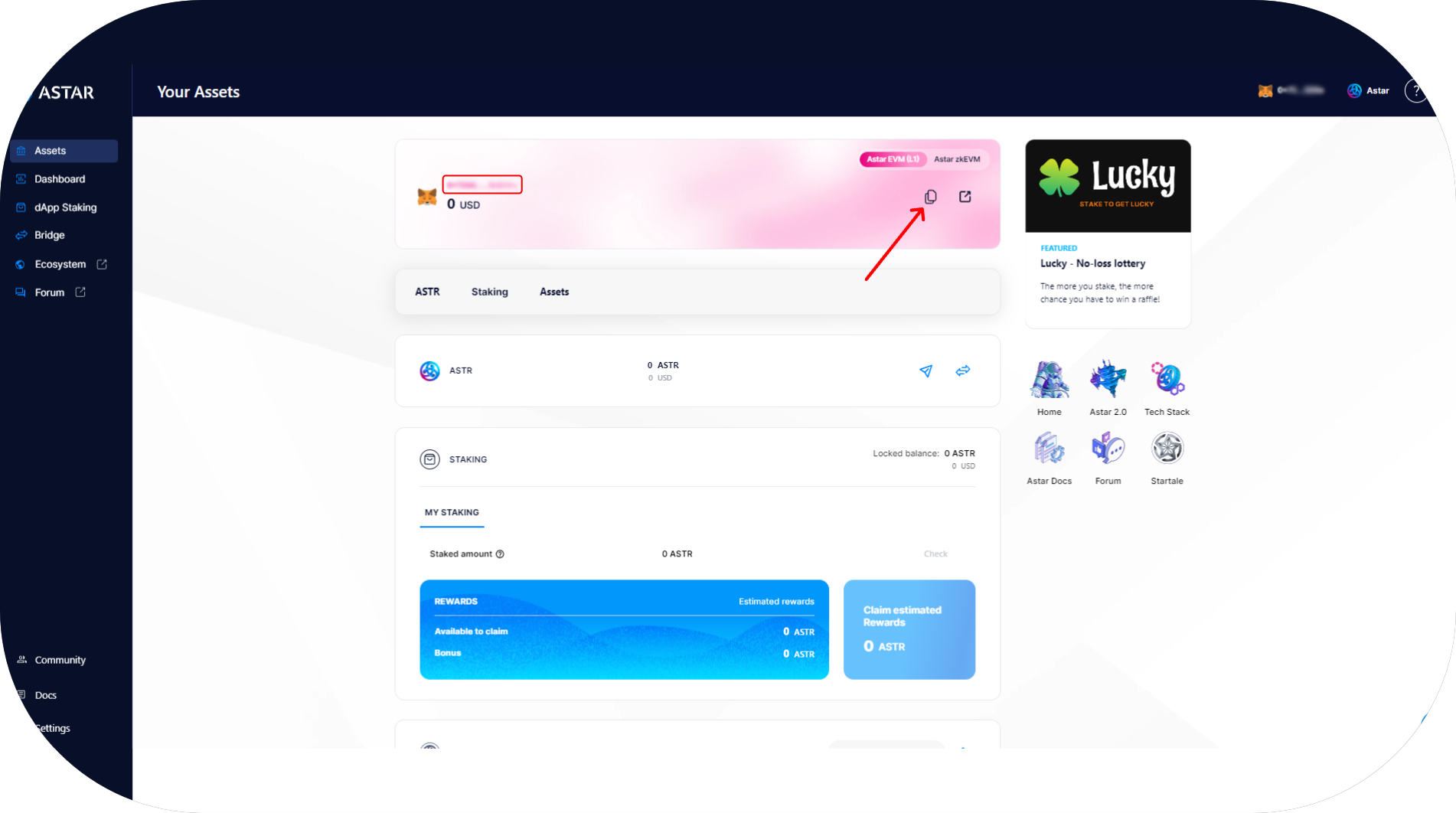 - Visit the Astar Portal and connect your Astar Substrate account to copy the address to which you want to receive your tokens;