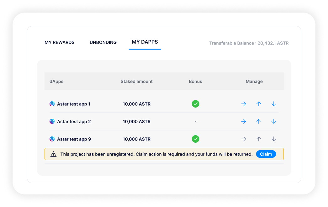 - Move (→) : you can move staked tokens between different dApps;