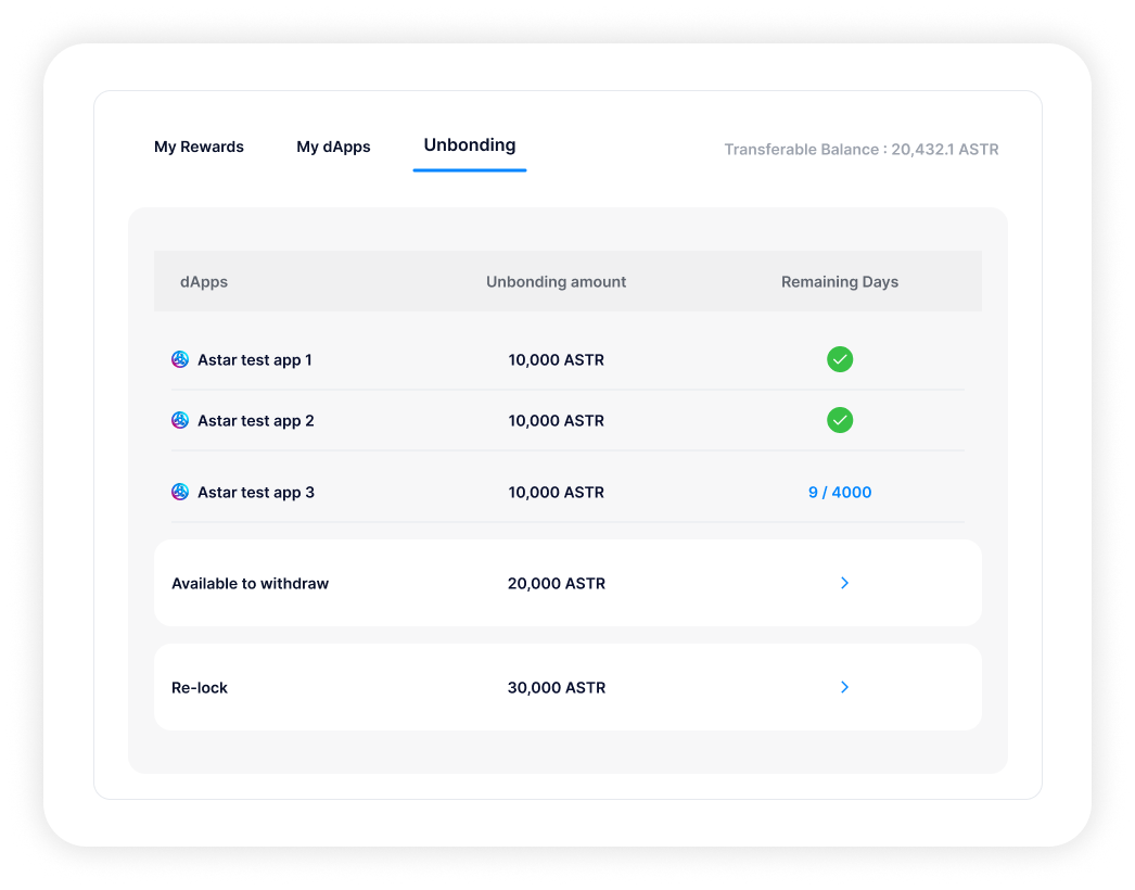 transferable; - Re-lock: Lock your tokens again to use them in dApp Staking;
