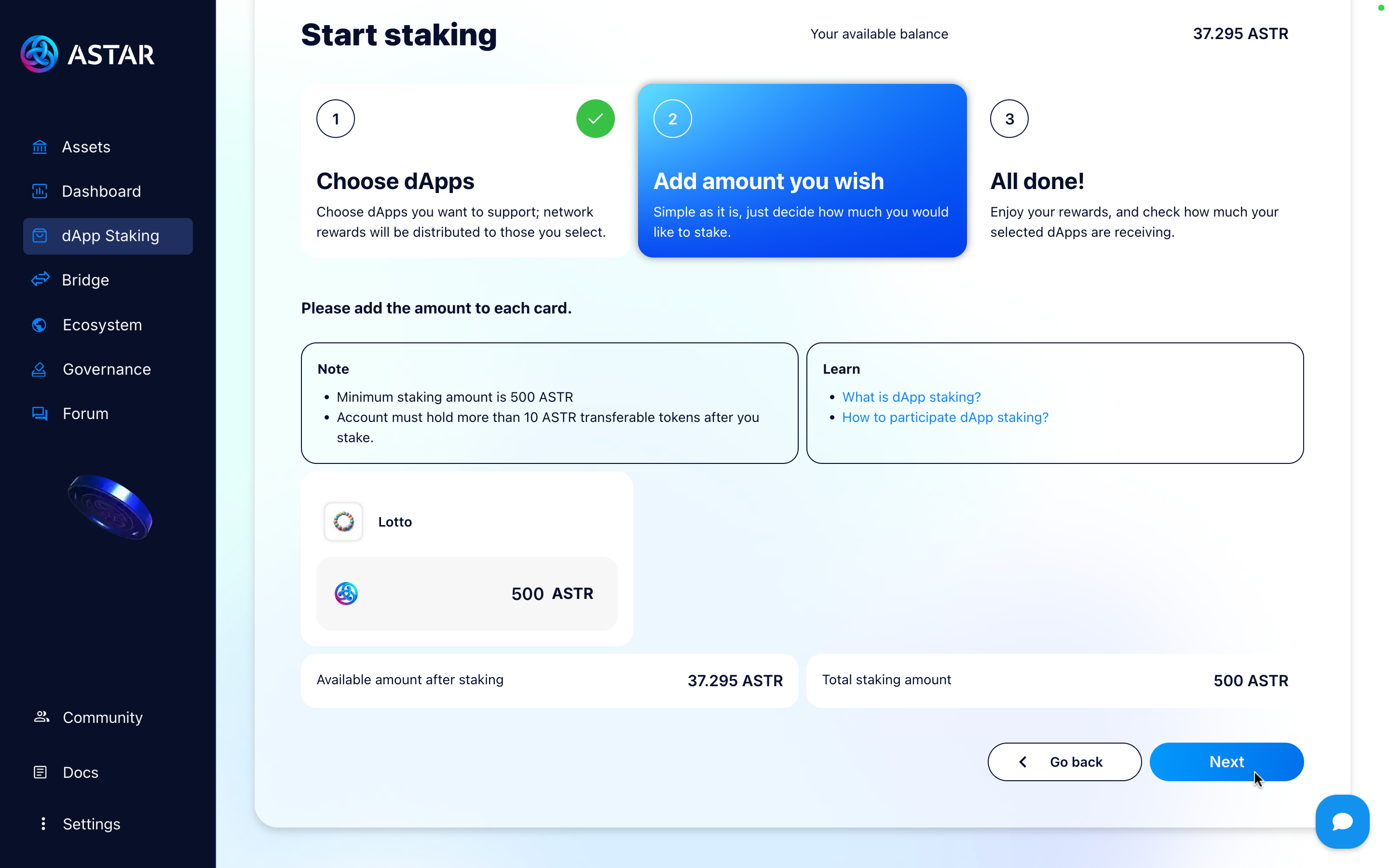 - Minimum of 500 ASTR required to stake