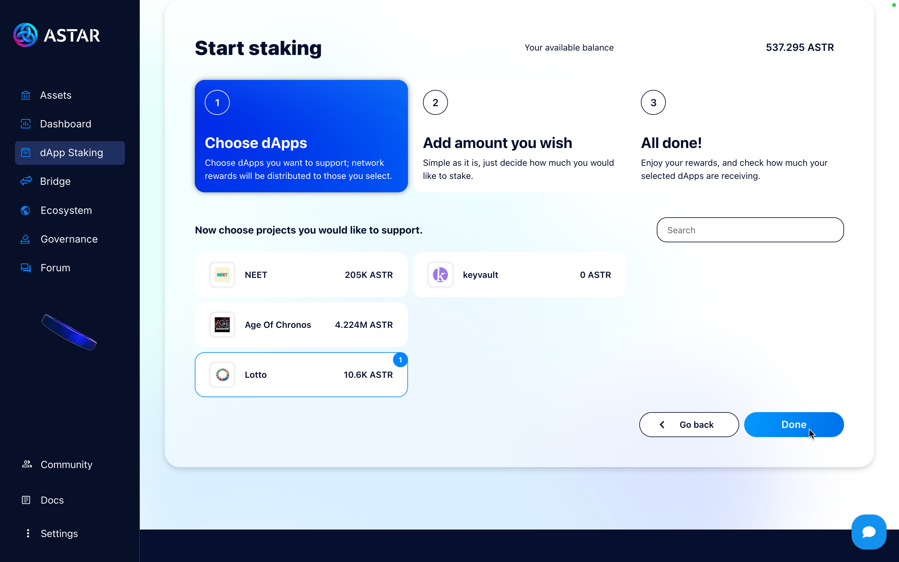 You can start staking either by clicking the blue "Choose dApps" button or by scrolling down to view all the listed dApps.