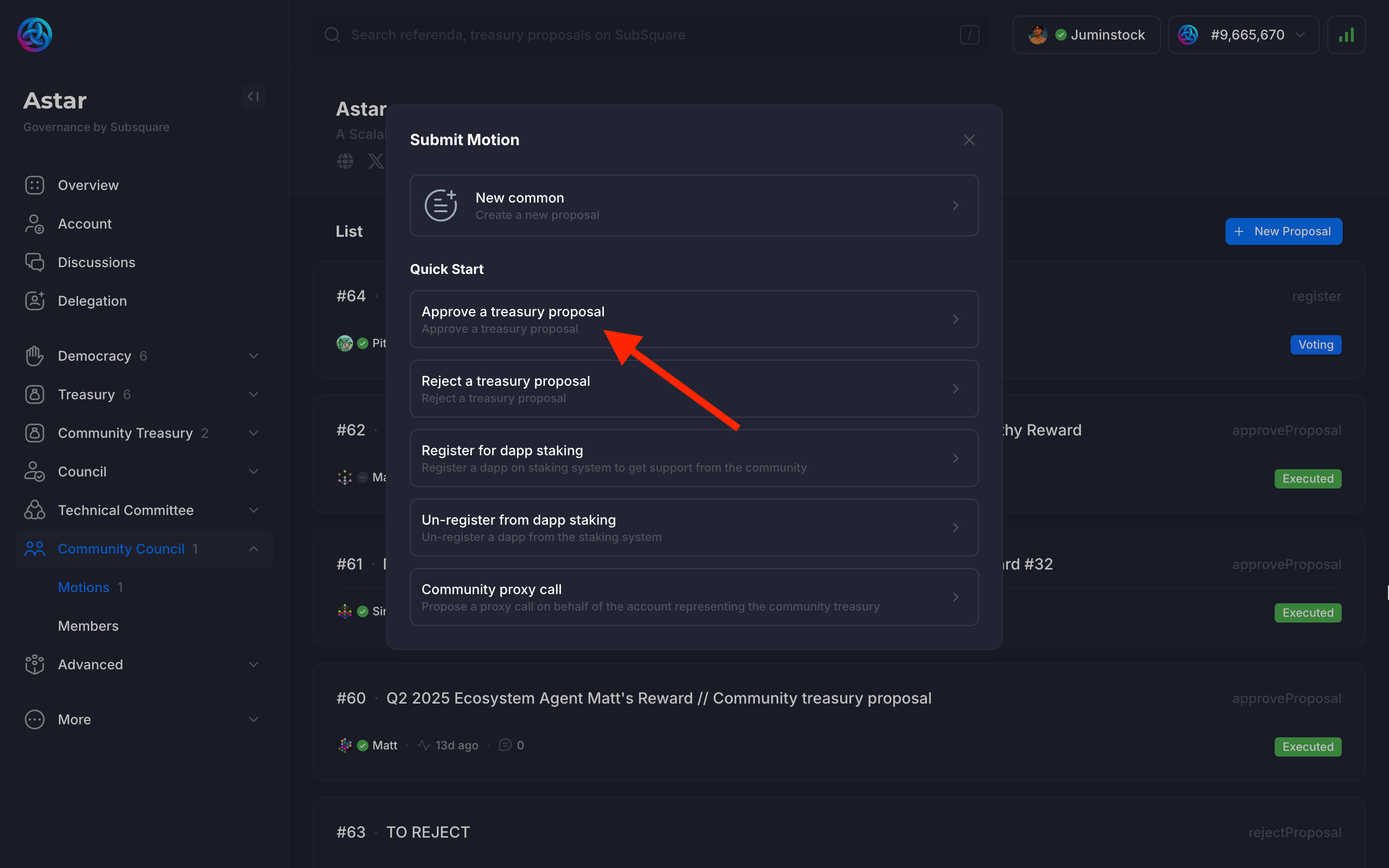 For this example, we will select the first option from the Quick Start: Approve a treasury proposal.