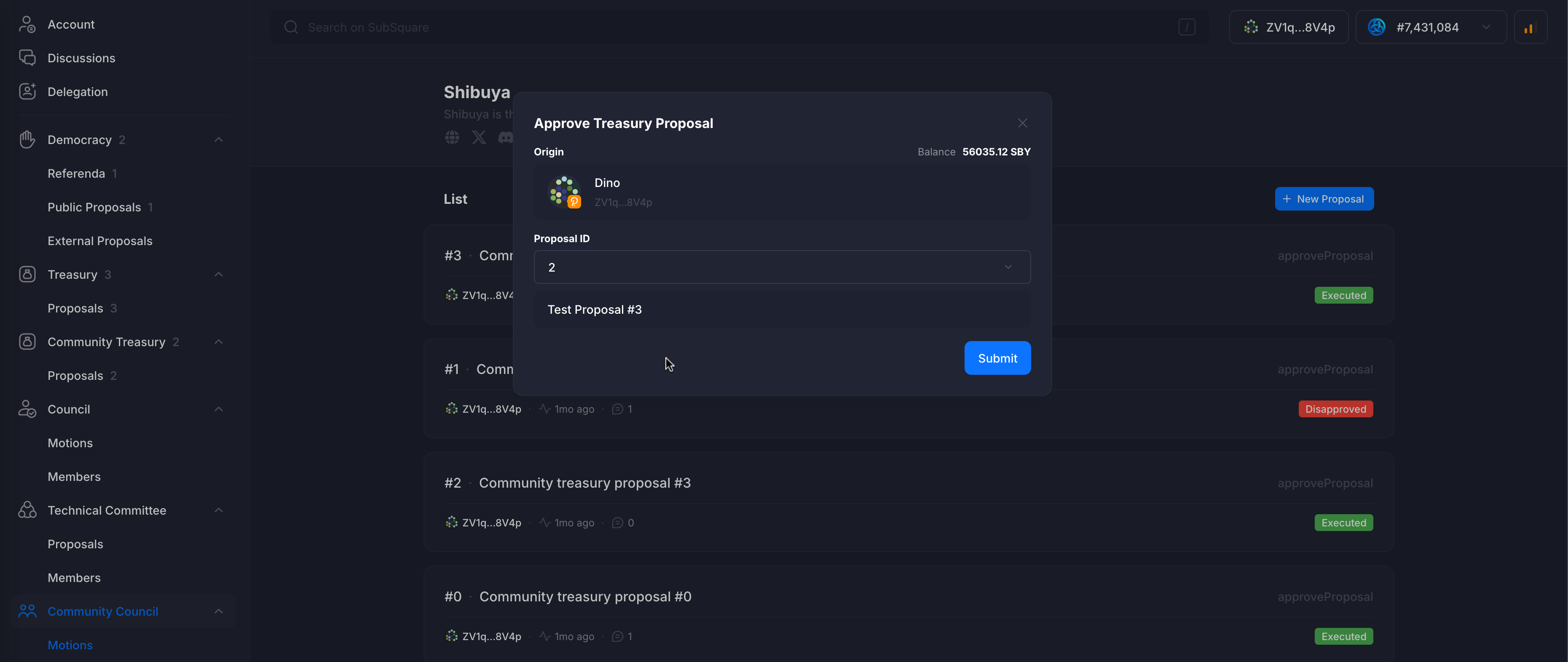 Once the proposal creation is submitted, it will be displayed on the Motions page.