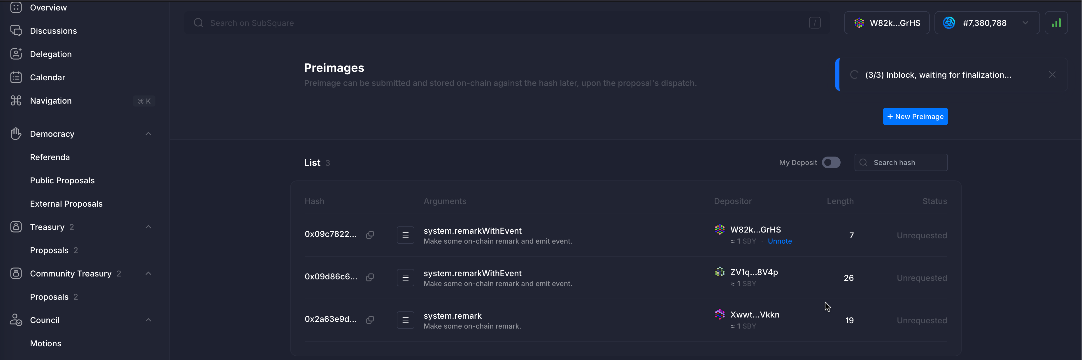 The first thing you need to do is create a preimage, which will contain the actions you want to execute onchain. To do this, go to the Advanced/Preimages section in the Subsquare left sidebar.