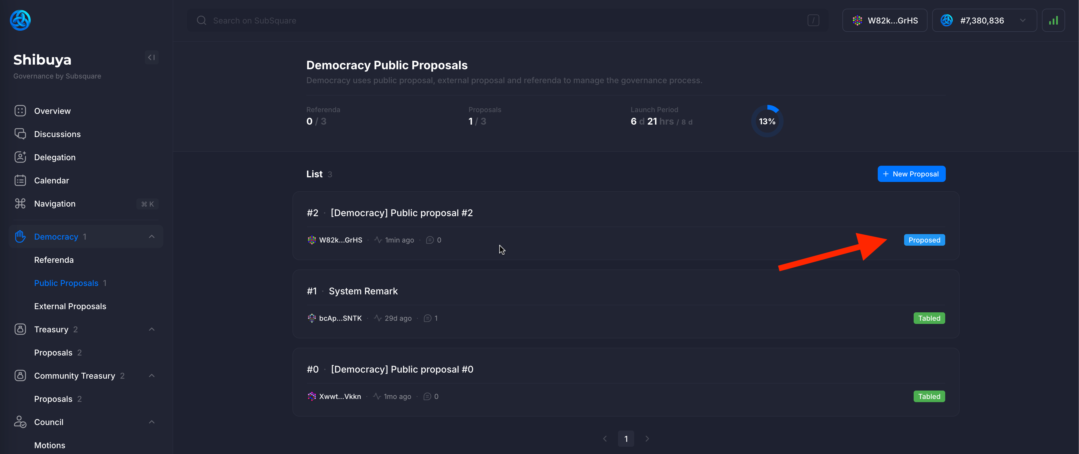 Afterwards, it can be observed under the list of public proposals. The status will be marked as Proposed, since it hasn't been tabled (or canceled) yet.