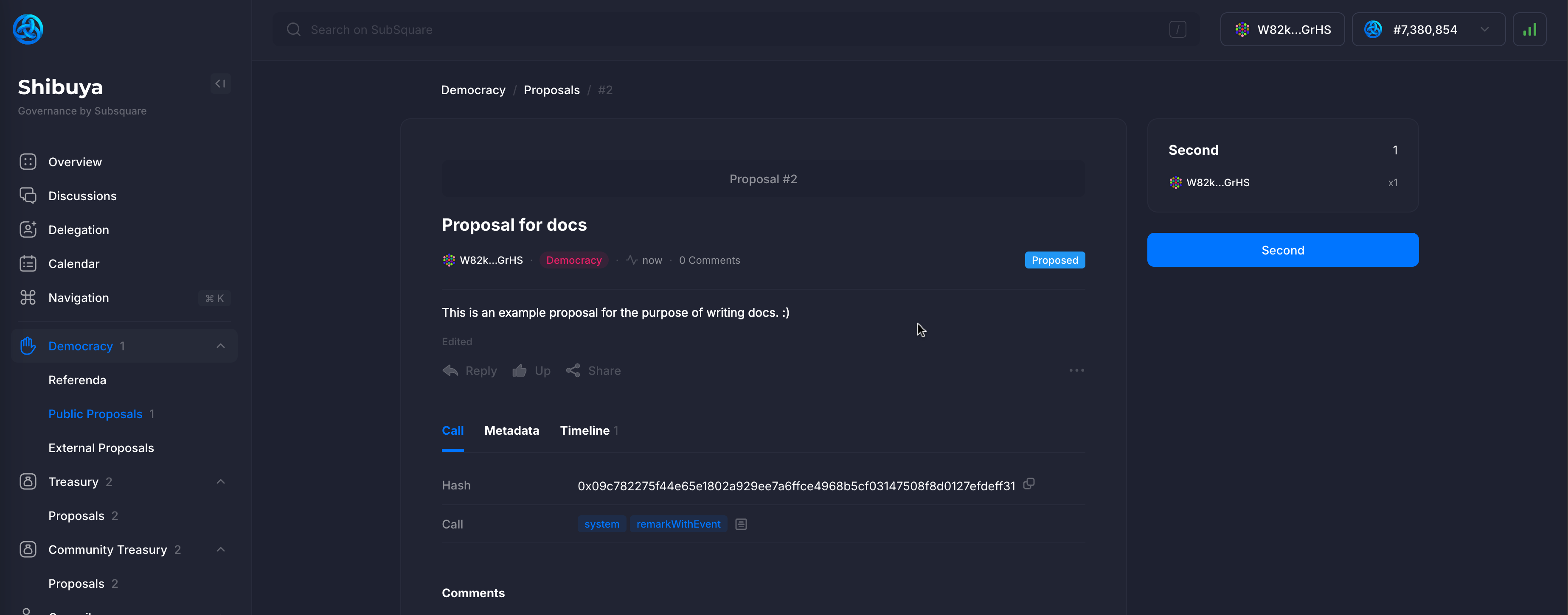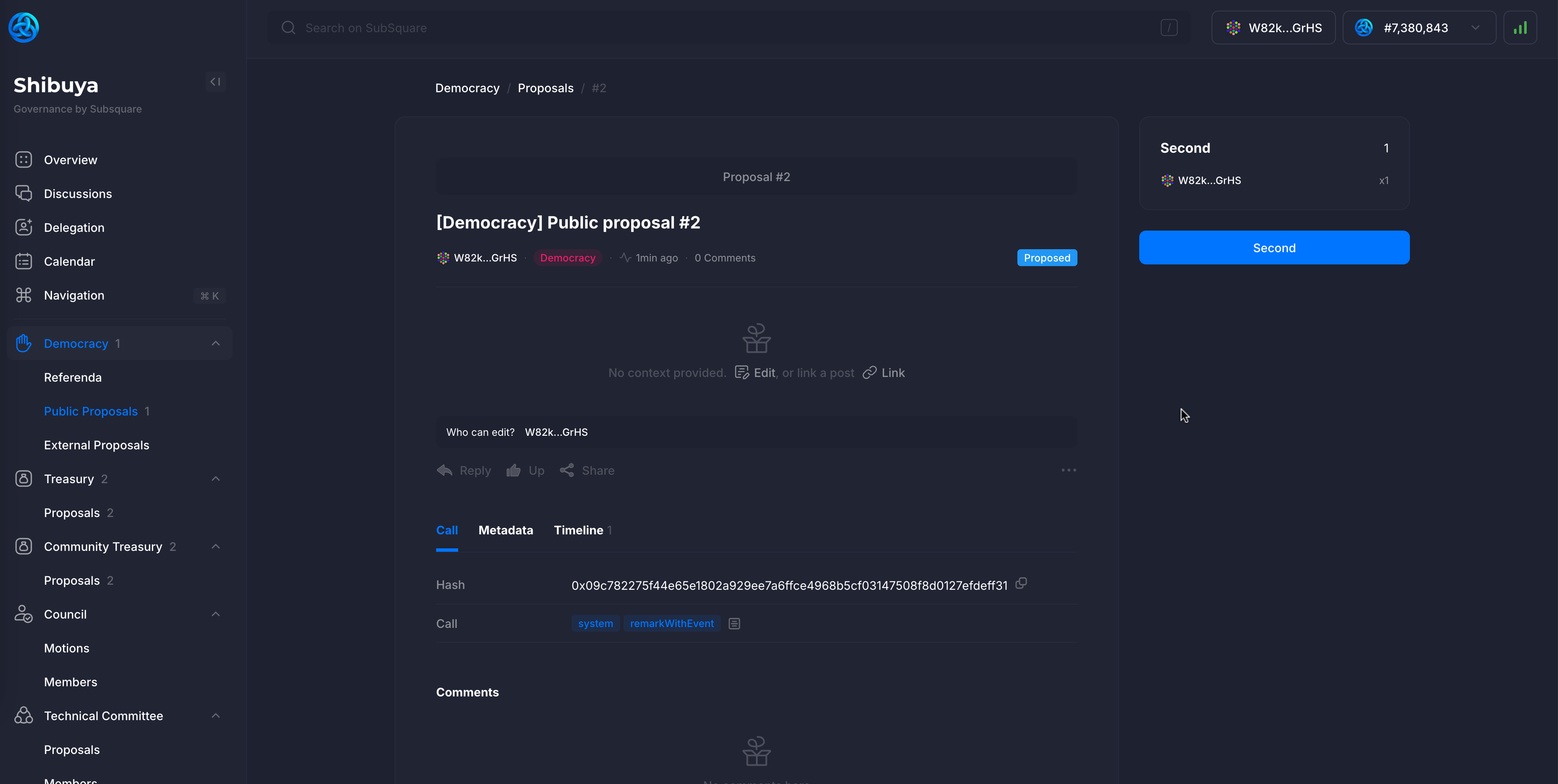 Clicking the Second button to support the proposal, increase its chances of being tabled and upgraded to a referendum. The user has to match the deposit of the proposal, which is displayed on the page. It is possible to second a proposal multiple times.