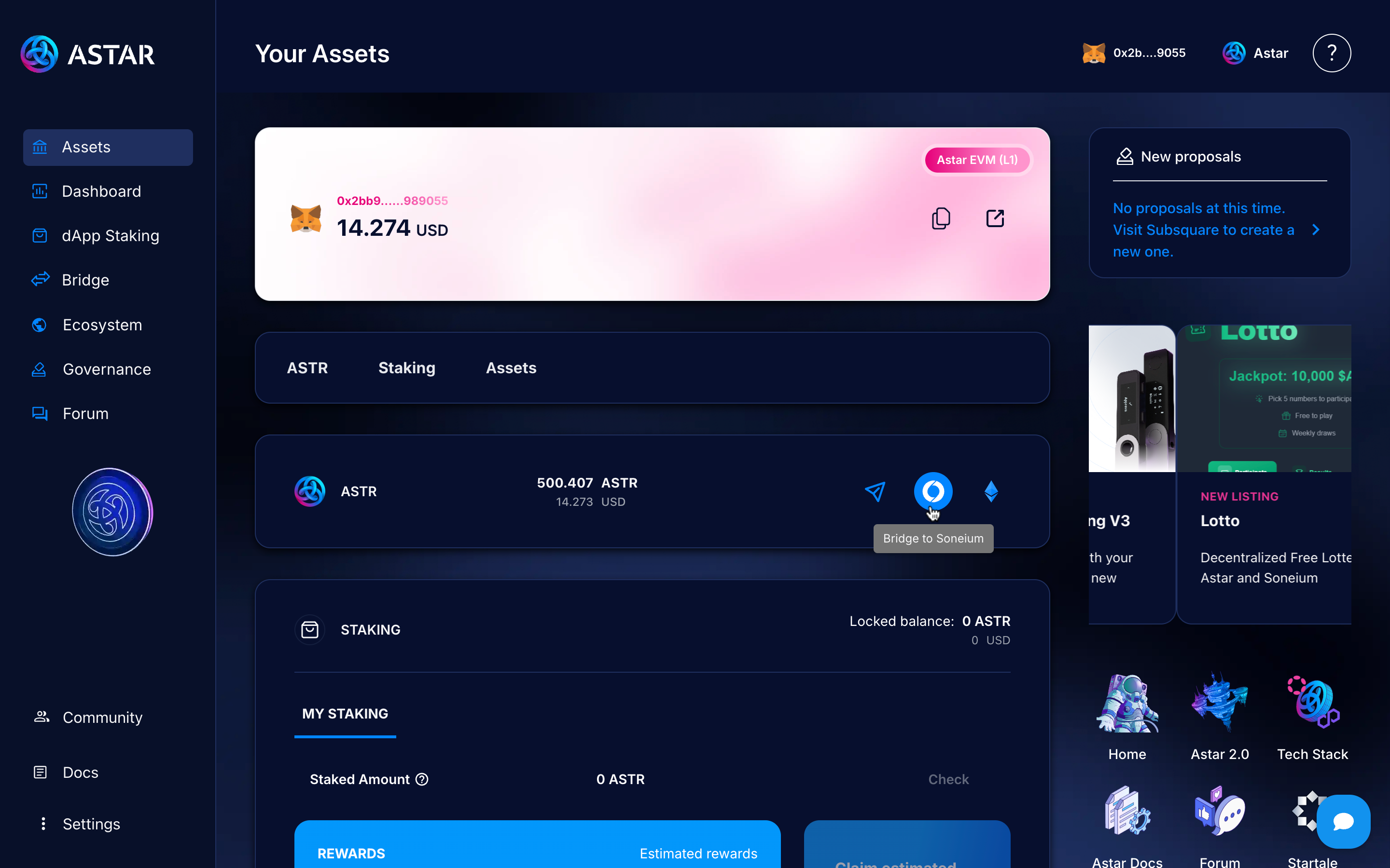 When you’re connected to your EVM wallet, you’ll be able to see your funds and an interface with additional options. Now, we have to bridge to Soneium.