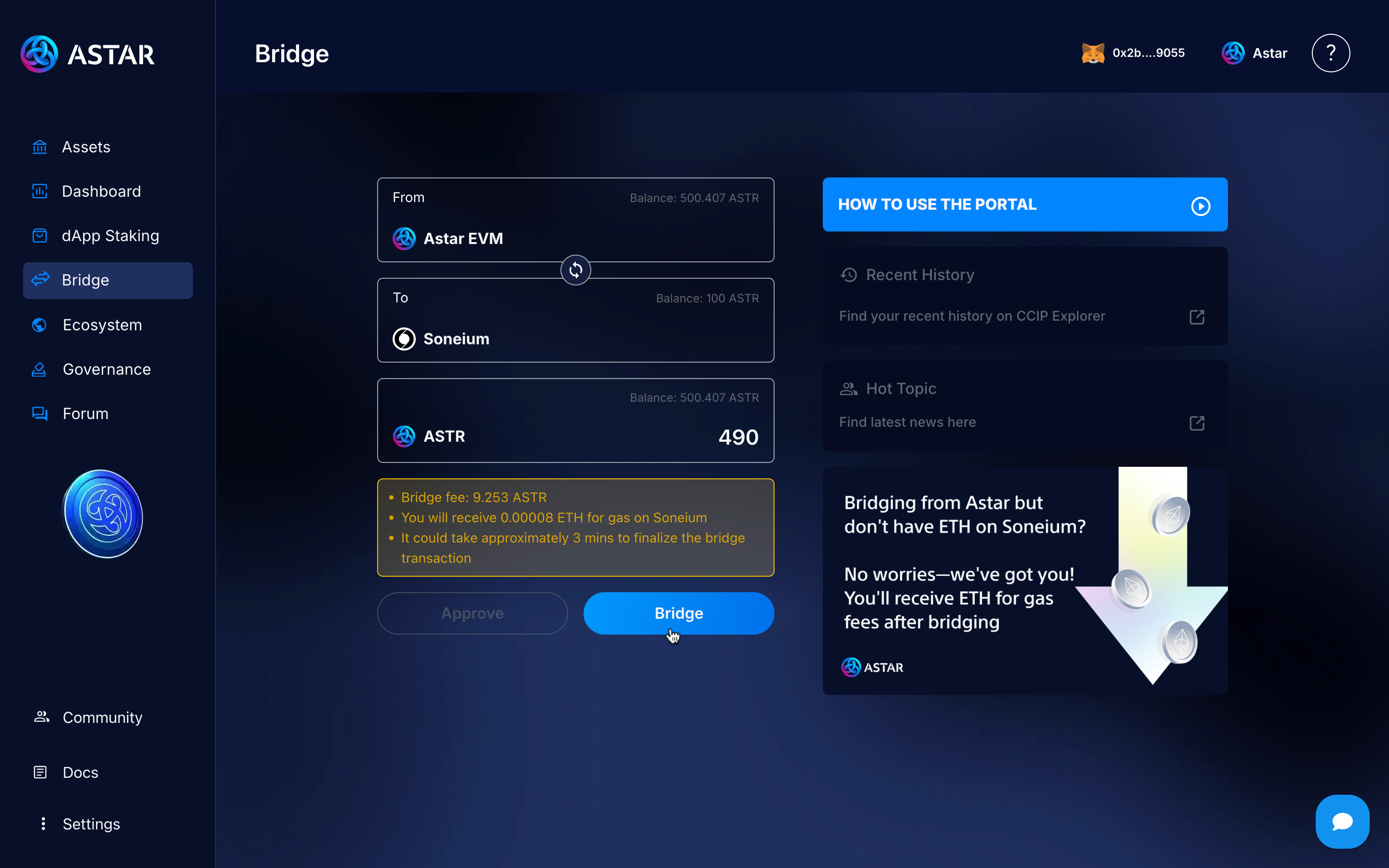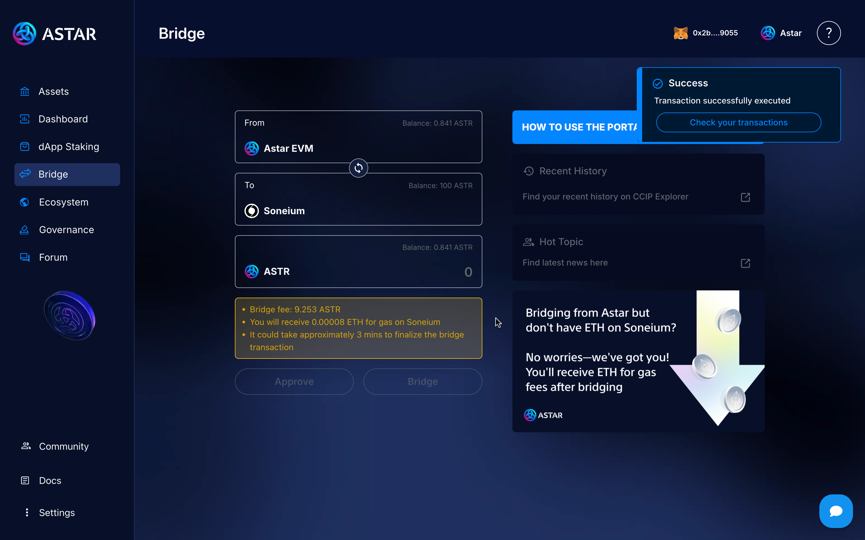Once you’re on the bridge page, you’ll see that the transaction is set to go from Astar EVM to Soneium. Enter the amount you want to send, approve the transaction by clicking the Approve button, and finally, initiate the bridge.