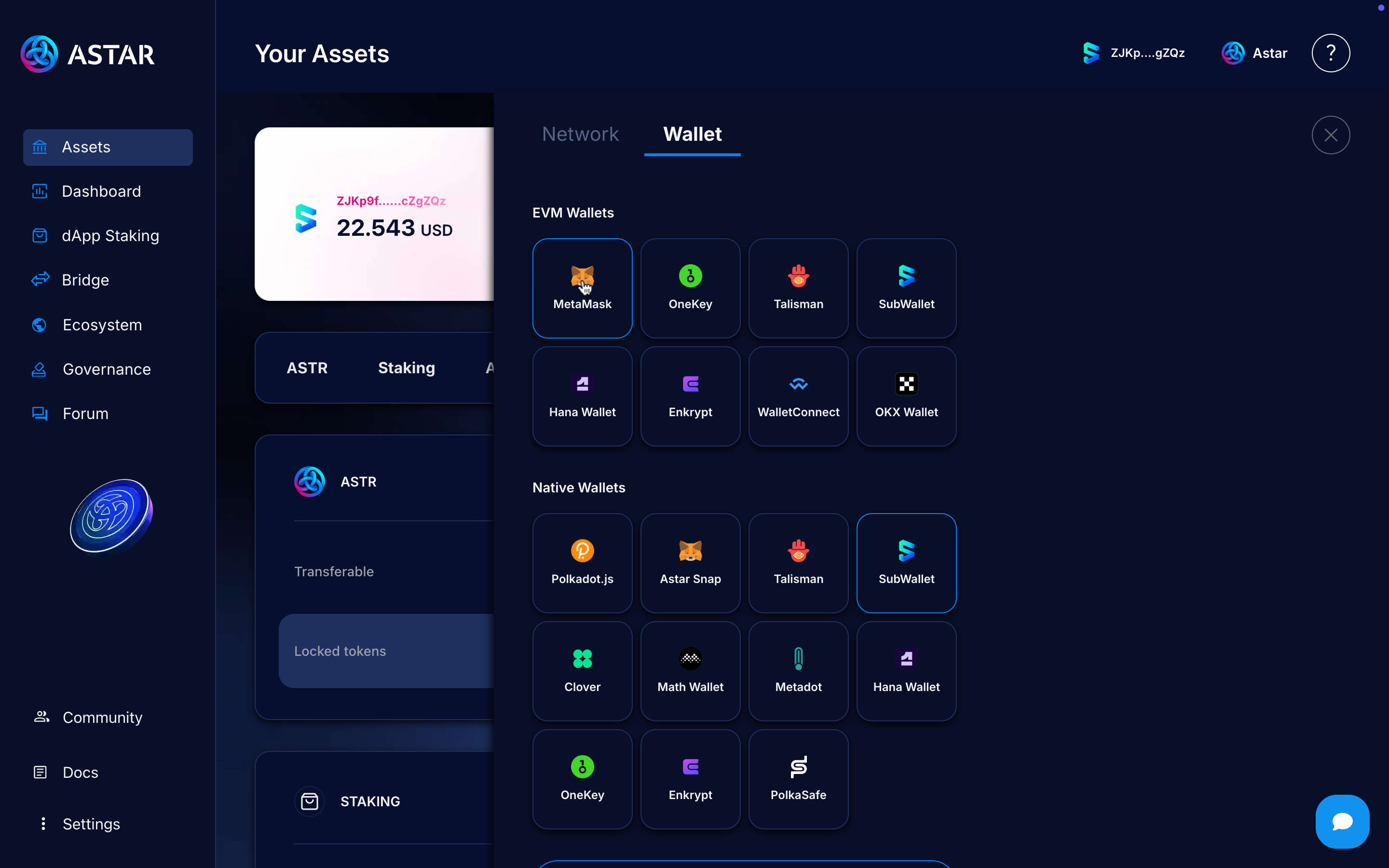 Choose the wallet you use, in this case, it will be Subwallet, so we’ll click on Subwallet logo to open the modal and connect it.